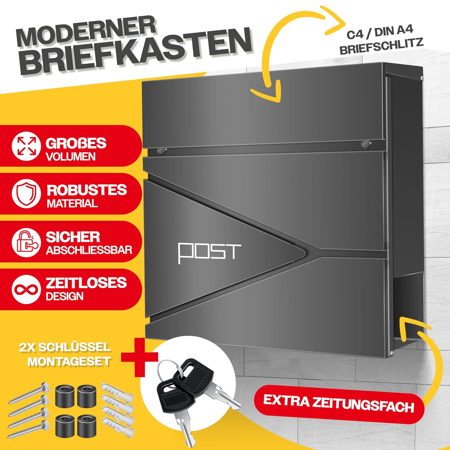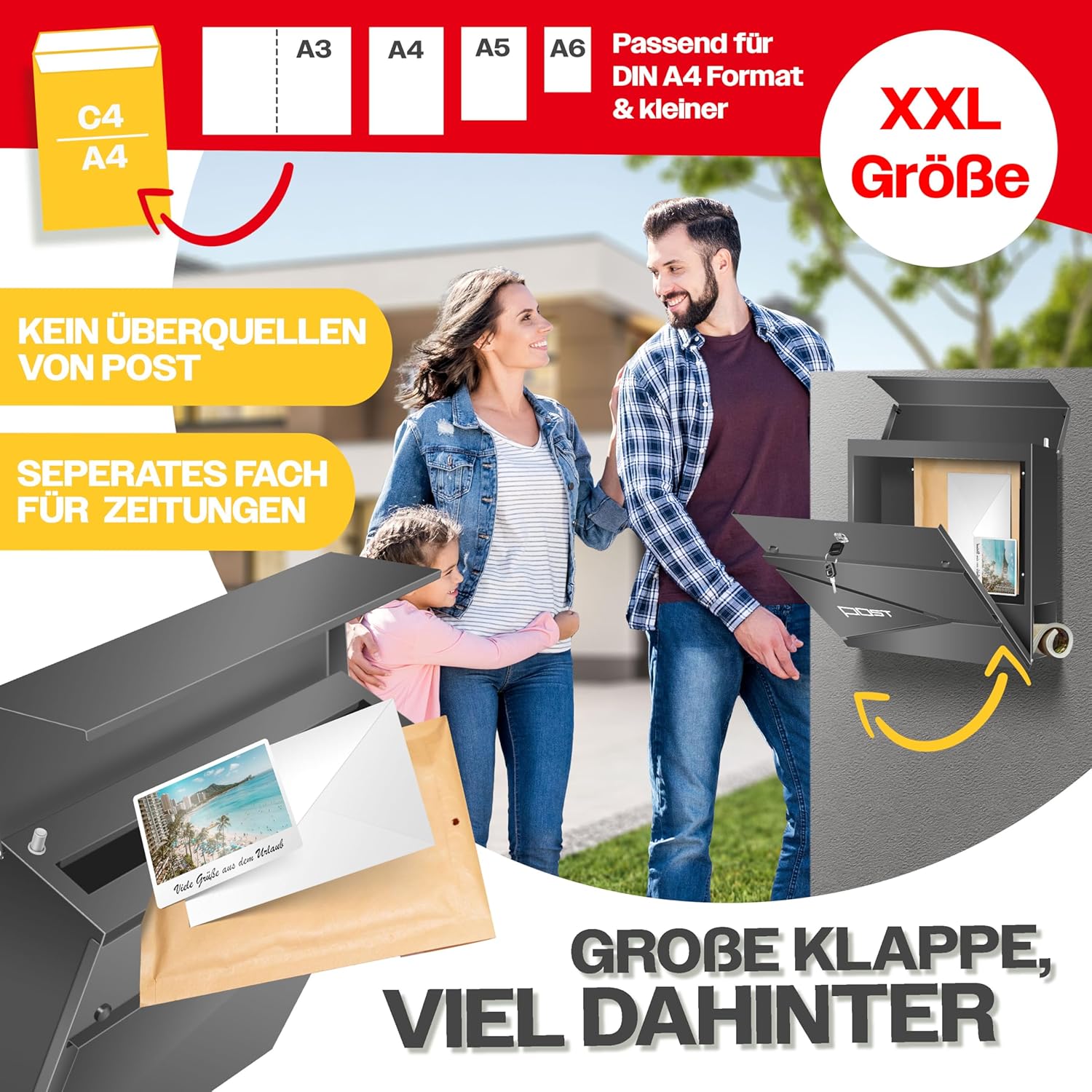 Das Kesser® Postfach wurde für die Bedürfnisse von Familien, kleinen Unternehmen und sogar Einzelpersonen entwickelt, die Wert auf Ordnung und Sicherheit legen. Mit seiner großzügigen C‑4‑Fachöffnung können Standardbriefe, Luftpolsterumschläge und kleine Pakete mühelos aufgenommen werden. Der integrierte Zeitungsfachbereich sorgt für klare Trennung und Übersichtlichkeit, sodass Zeitschriften, Broschüren und andere Unterlagen ordentlich verstaut bleiben.
