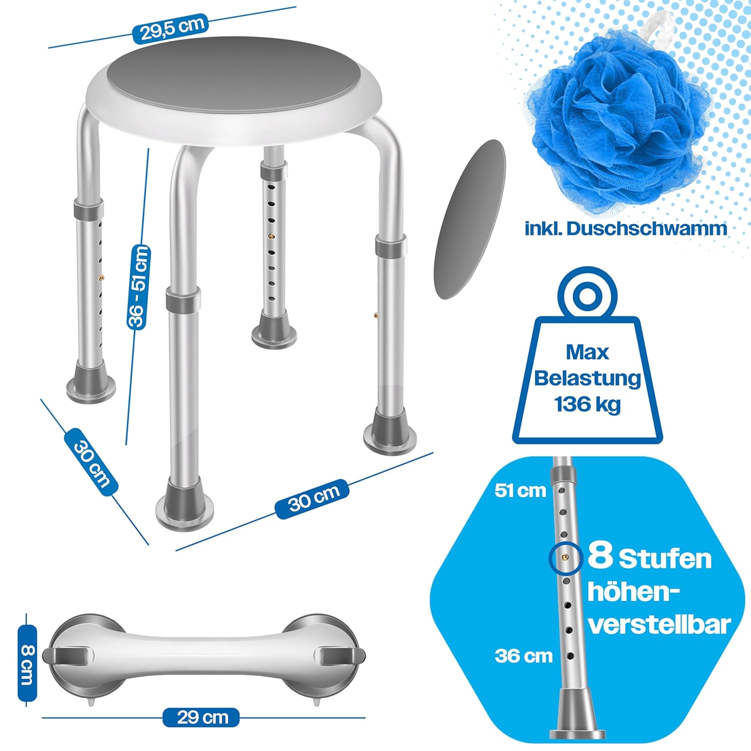 Der KESSER® Shower Stool bietet eine Sitztiefe von 30 cm, die eine angenehme Rückenlage ermöglicht. Der integrierte Duschhalter sorgt dafür, dass die Dusche stets griffbereit ist, ohne dass Sie sie in der Hand tragen oder nach unten greifen müssen. Zusätzlich kommt ein weicher Duschspongie mitgeliefert, der die Haut sanft reinigt und gleichzeitig die Dusche vor Schmutz schützt. Diese kleinen Extras verleihen dem Produkt ein Gefühl von Luxus und sorgen dafür, dass der tägliche Duschvorgang zu einem entspannten Erlebnis wird.