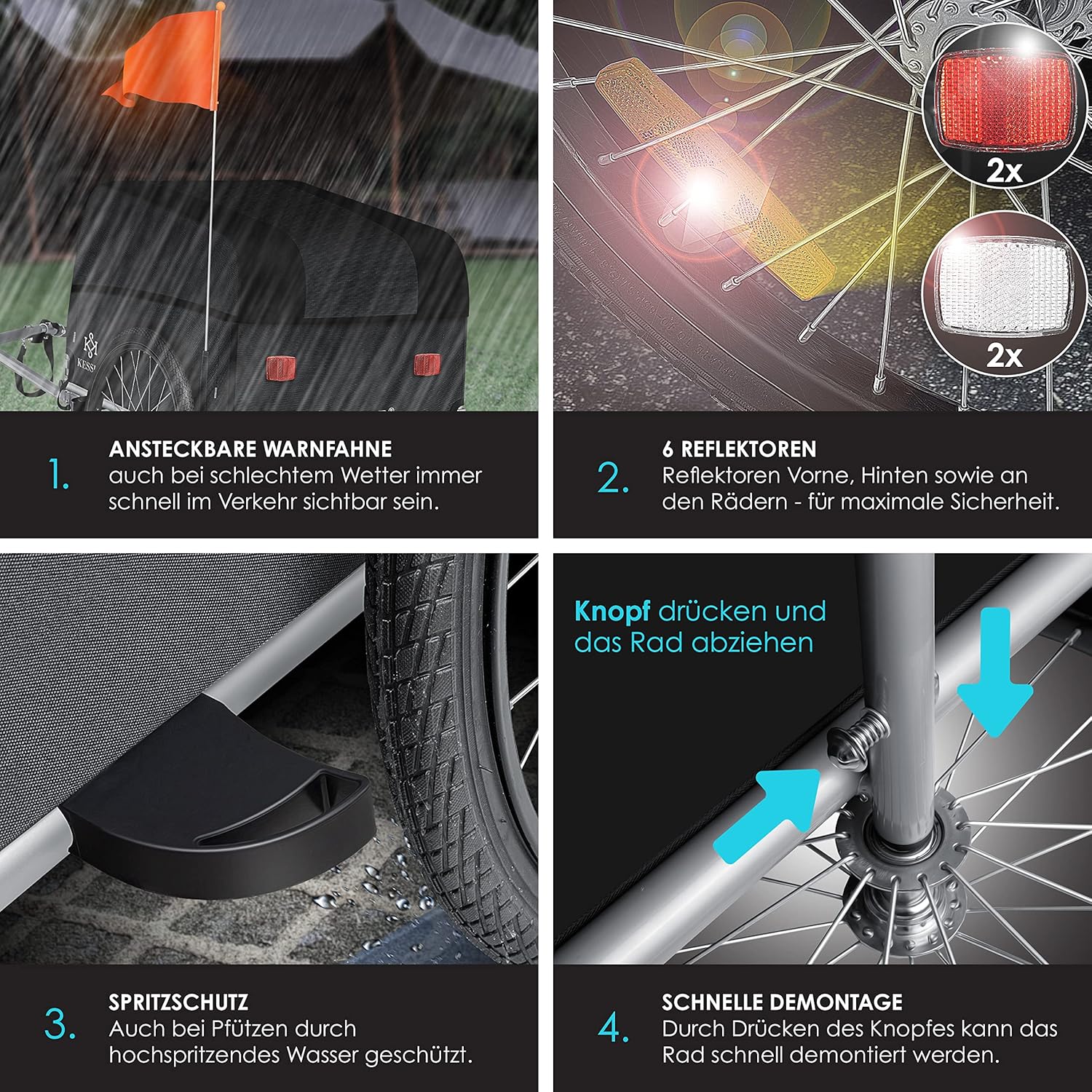 Zur Erhöhung der Sicherheit sind sechs reflektierende Streifen strategisch platziert: zwei vorne, zwei an den Rädern und zwei hinten. Diese sorgen für eine klare Sichtbarkeit bei Dunkelheit oder bei schlechten Lichtverhältnissen. Ein Warnflagge in Signal‑Farbe ergänzt die Sichtbarkeit und macht den Anhänger bei jeder Fahrt deutlich erkennbar. Die rutschfesten, pneumatischen Reifen garantieren ein angenehmes Fahrverhalten auf verschiedenen Untergründen, während ein Fahrradventil das schnelle Aufpumpen der Reifen ermöglicht.