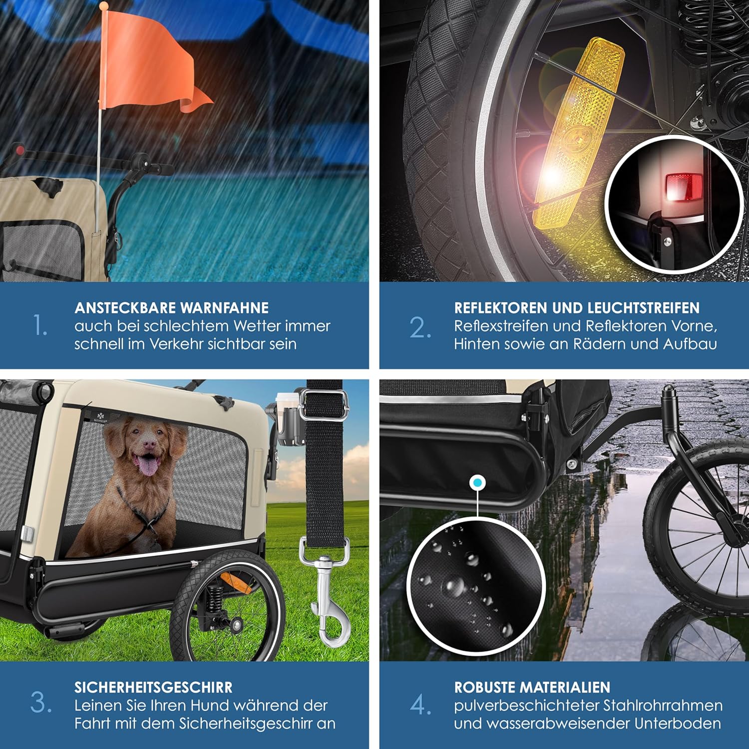 - Sicherheitsgeschirr: hält Ihren Hund sicher im Anhänger