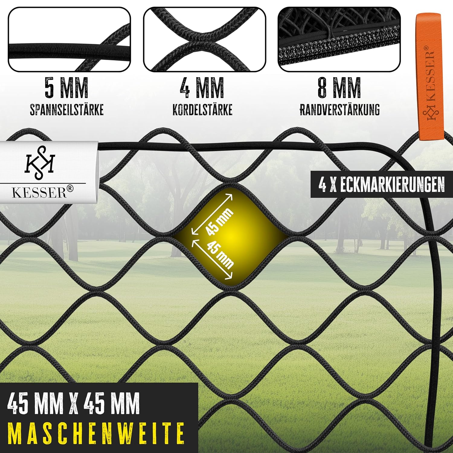 Die Grundlage des Netzes ist ein hochwertiges Polypropylen‑Gewebe, das sich durch hohe Festigkeit und Flexibilität auszeichnet. Die Spannseile, die das Netz stabilisieren, haben einen Durchmesser von 5 mm – ein ausgewogenes Verhältnis von Stärke und Handhabung. Das Mesh selbst ist mit 4 mm stark verstärkten Seilen ausgestattet, die eine hohe Belastbarkeit gewährleisten. Durch die Kombination aus robustem Gewebe und verstärkten Seilen bleibt das Netz auch bei wiederholtem Gebrauch in einwandfreiem Zustand.